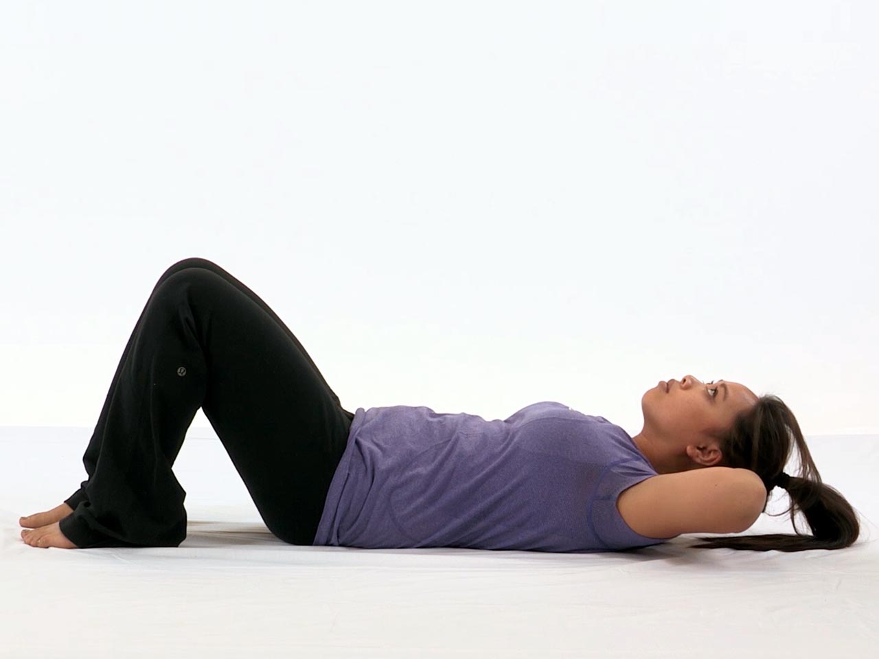 - Lie on your back with your knees bent and feet flat on the floor pointed straight ahead.